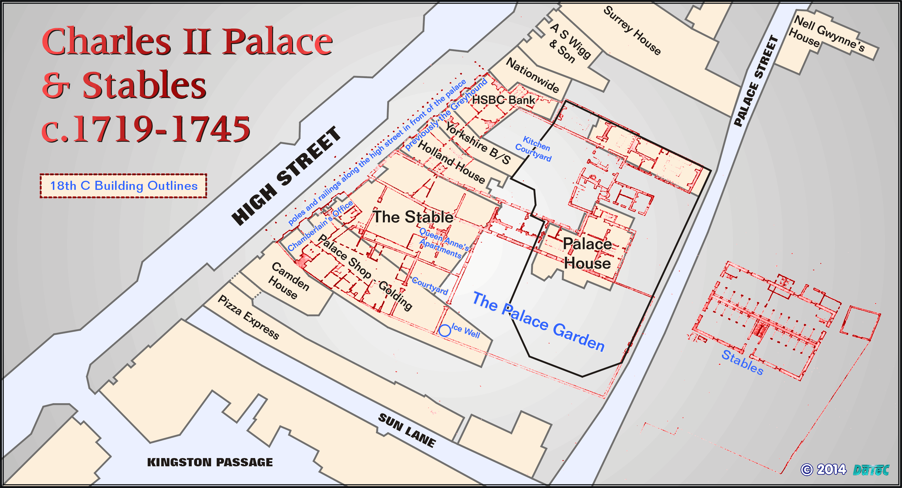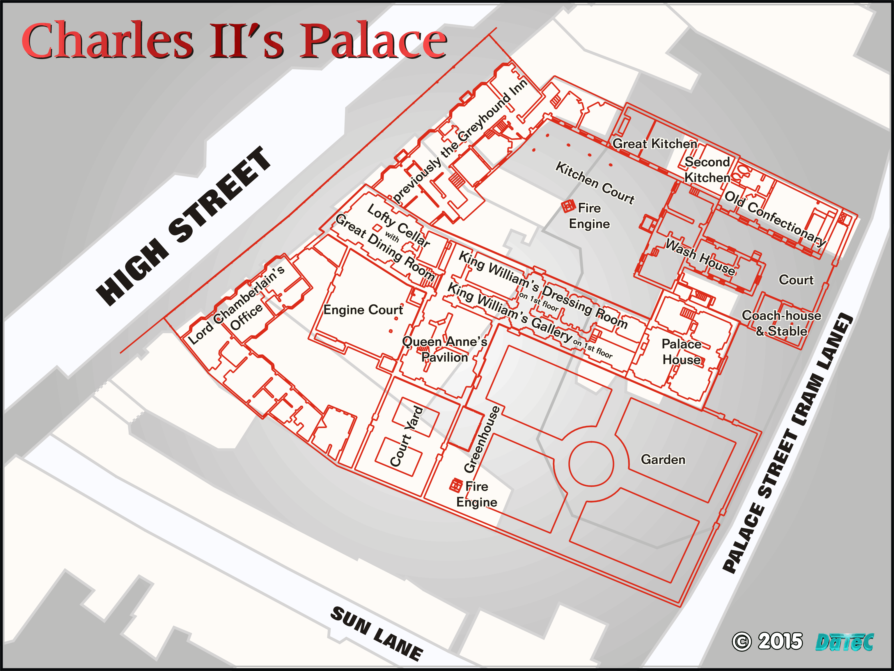 - Charles II's Palace map also shows the original location of the Greyhound Inn, which was purchased by Charles II in order to construct his palace