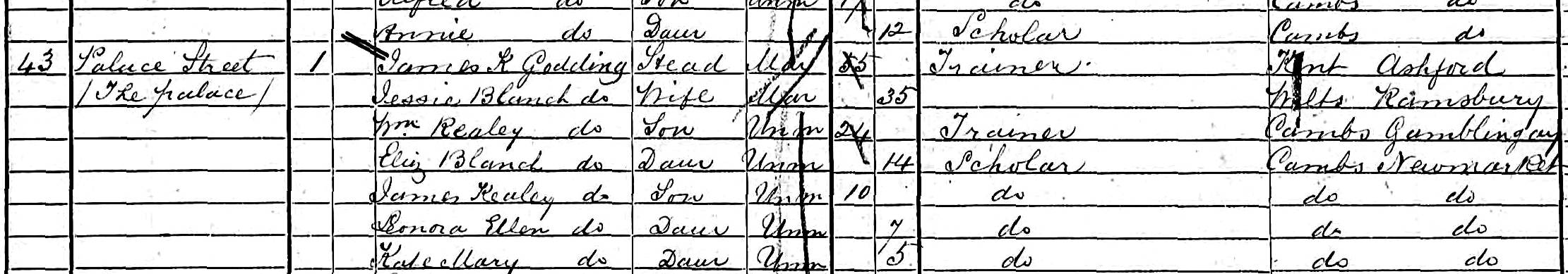 James Bartholomew had been quite a famous jockey and also a publican at two of the inns in Newmarket - details about him can be found on the page for the White Lion - No.216 High Street. [The assumption here is that this was James Bartholomew Snr. who was the head lad - his son, another James Bartholomew, was only 18 in 1875 - could he have been the head lad? - in the 1881 census he's listed as living at home and being of 'no occupation'.]