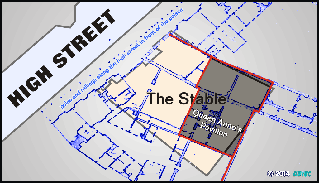 The map above shows the plans of this palace by Thomas Fort, Clerk of Works (1719-1745), overlaid onto an outline map of the present-day shops on the southern side of Newmarket High Street.
