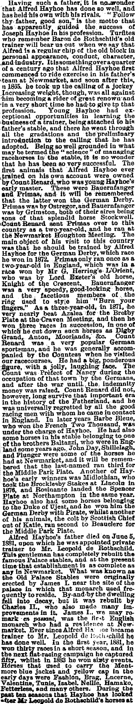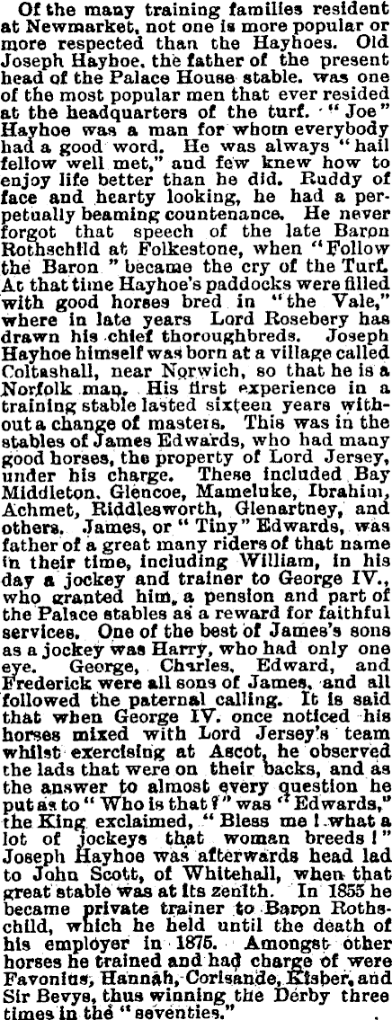 Bury Free Press Saturday 24 September 1881 The late Mr. Joseph Hayhoe’s Will. - The will (dated May 24, 1881) of Mr. Joseph Hayhoe, late of Newmarket, trainer, who died on June 5th last, proved on the 31st ult. by Alfred Hayhoe, the son, and William Barrow, the executors, the personal estate exceeding £7,000. The testator leaves his house and stables in Palace-street, with the furniture, saddlery, and effects, to his son Alfred ; Derby House to his son Charles; Kisber Villa upon trust for his daughter, Mrs. Gardner; Fashion Cottage upon trust for his daughter, Mrs. Moody ; £5OO each to his wife, Mrs. Mary Hayhoe, and his daughter, Mrs. Grimshaw ; and there are other bequests to children. |