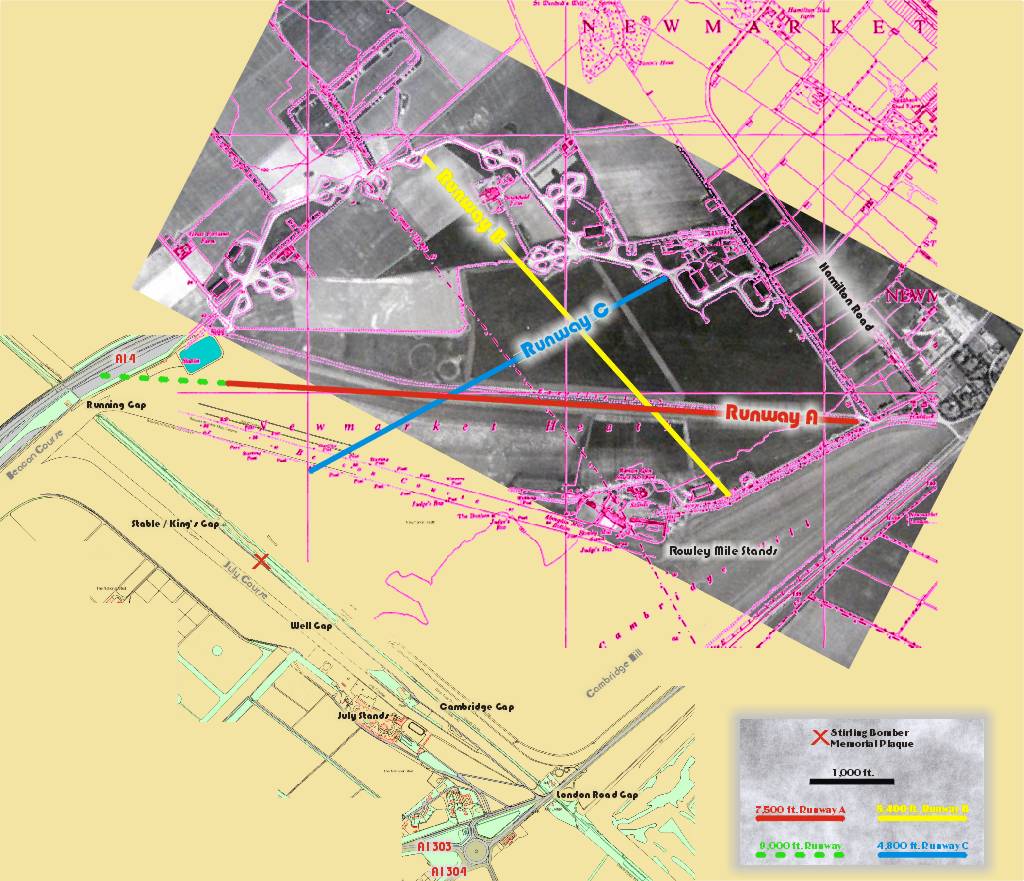 It would seem that when the RAF engineers initially surveyed this area at the beginning of the war that this runway was aimed approximately at the Running Gap - but remember that the Jockey Club still had significant influence here, and they wouldn't have wanted these aircraft taking off too close to any of the July Course (that was still operating as a race venue during this period). Based upon this it would seem that this runway had to be pointed very slightly further north of this location. Plus of course the prevailing wind direction also had the effect of veering the ascending aircraft into this direction.