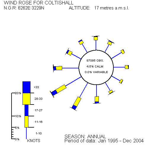 The above image is a wind rose diagram - where the length of the coloured blocks shows the strength of the wind, all arranged around the points of the compass. It shows that for RAF Coltishall in Norfolk, averaged across the year, the prevailing wind direction for this location is once again from just south of west.