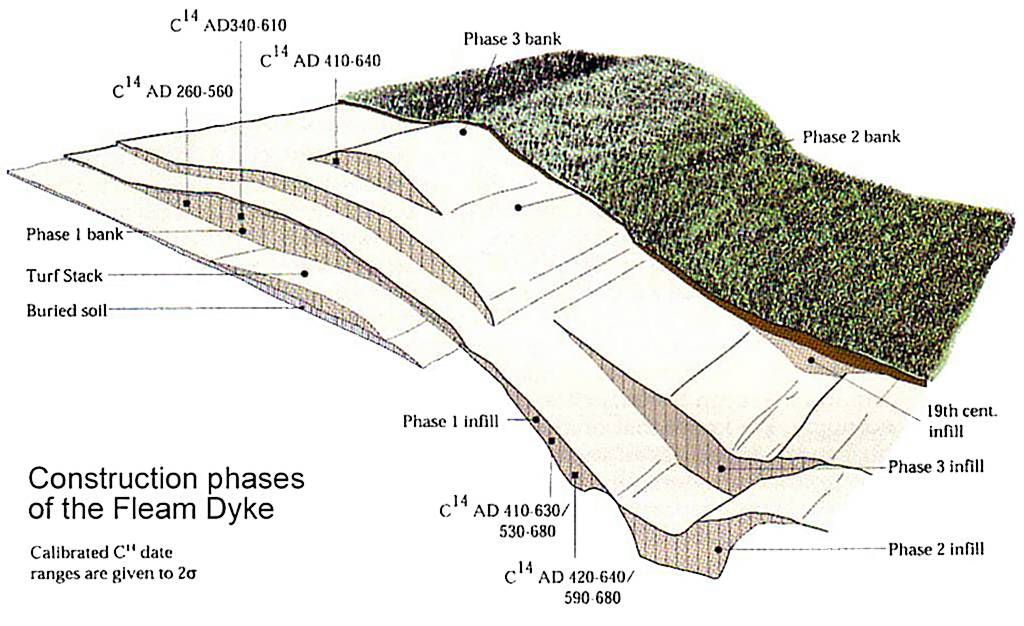 Carbon 14 dating of the nearby Fleam Dyke, showing the various layers and construction phases
