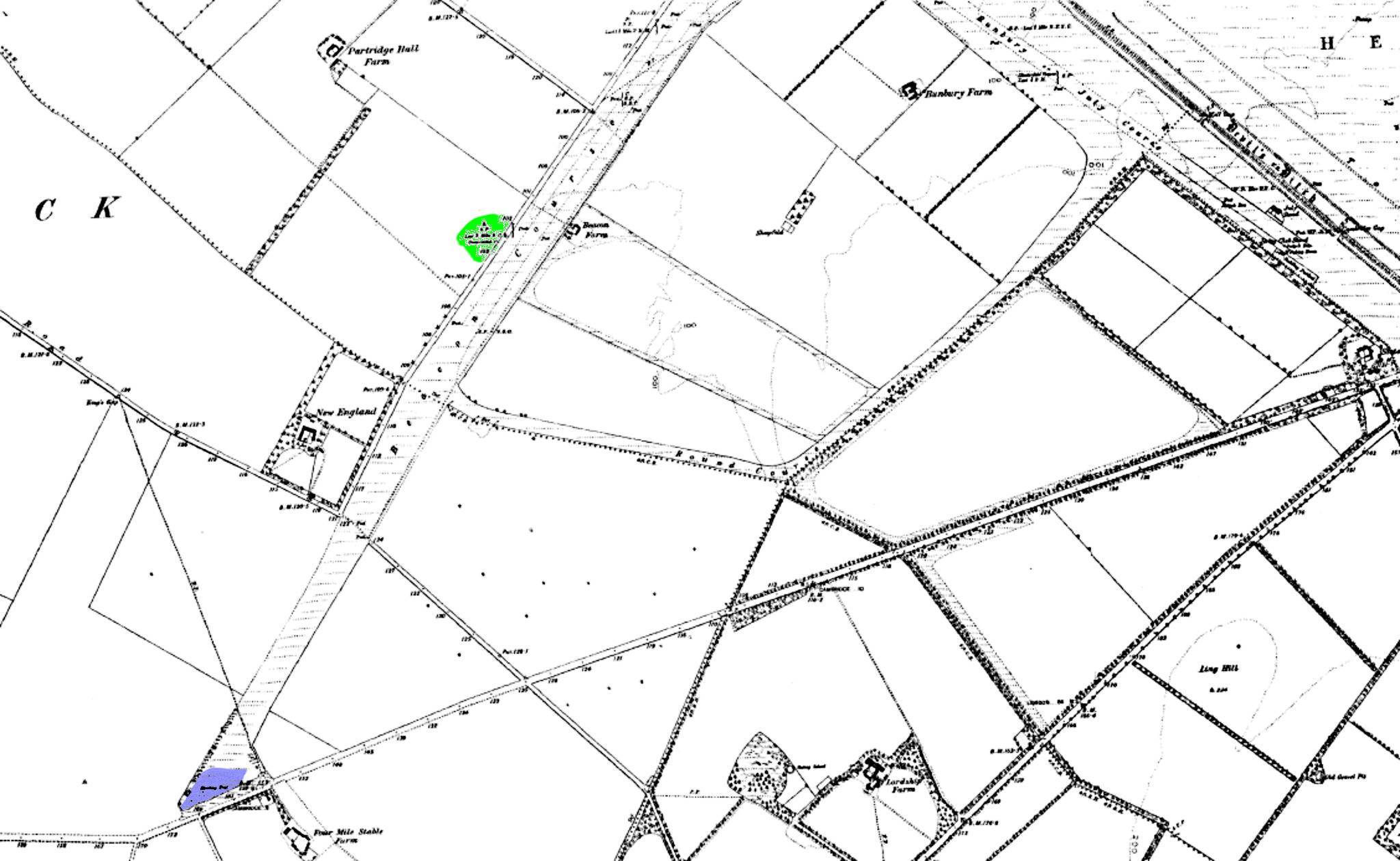 Actually the main starting post for the Beacon Course was another mile further away, in front of the aforementioned Four Mile Stable Farm (highlighted in blue on the map below). As can be seen on this map the Beacon Course went right across the Swaffham Bulbeck Road. This part of the course has been squeezed-out by the A14 / A11 dual carriageway, leaving the starting post for the modern-day longer distance Newmarket races at the location where the Round Course meets the Beacon Course. Although the old course is now gone the original 'Beacon' starting post is kept in the National Horse Racing Museum in Newmarket and in the field where it originally stood there's a replica to mark its position.