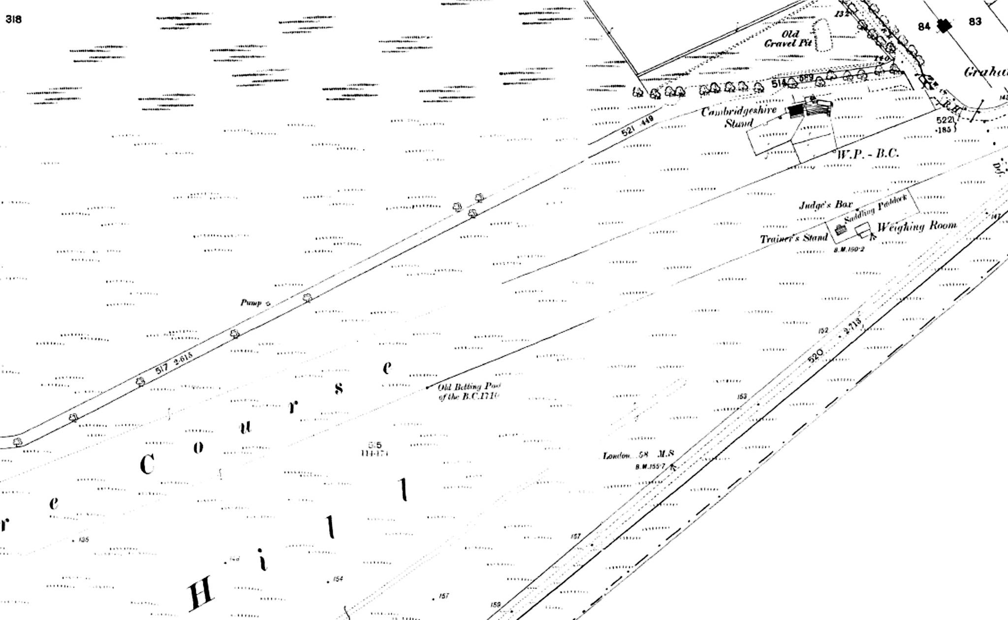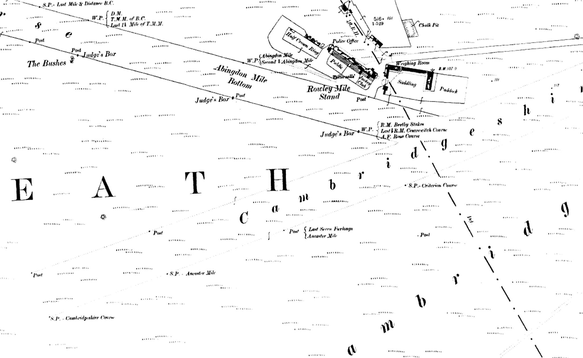 The 'Birdcage' with its Trainer's Stand and Weighing Room was located on the southern part of the present-day practise cricket pitch, with the famous winning post (W.P.) for the Beacon & Cambridgeshire courses sitting quite close to the western end wicket position.