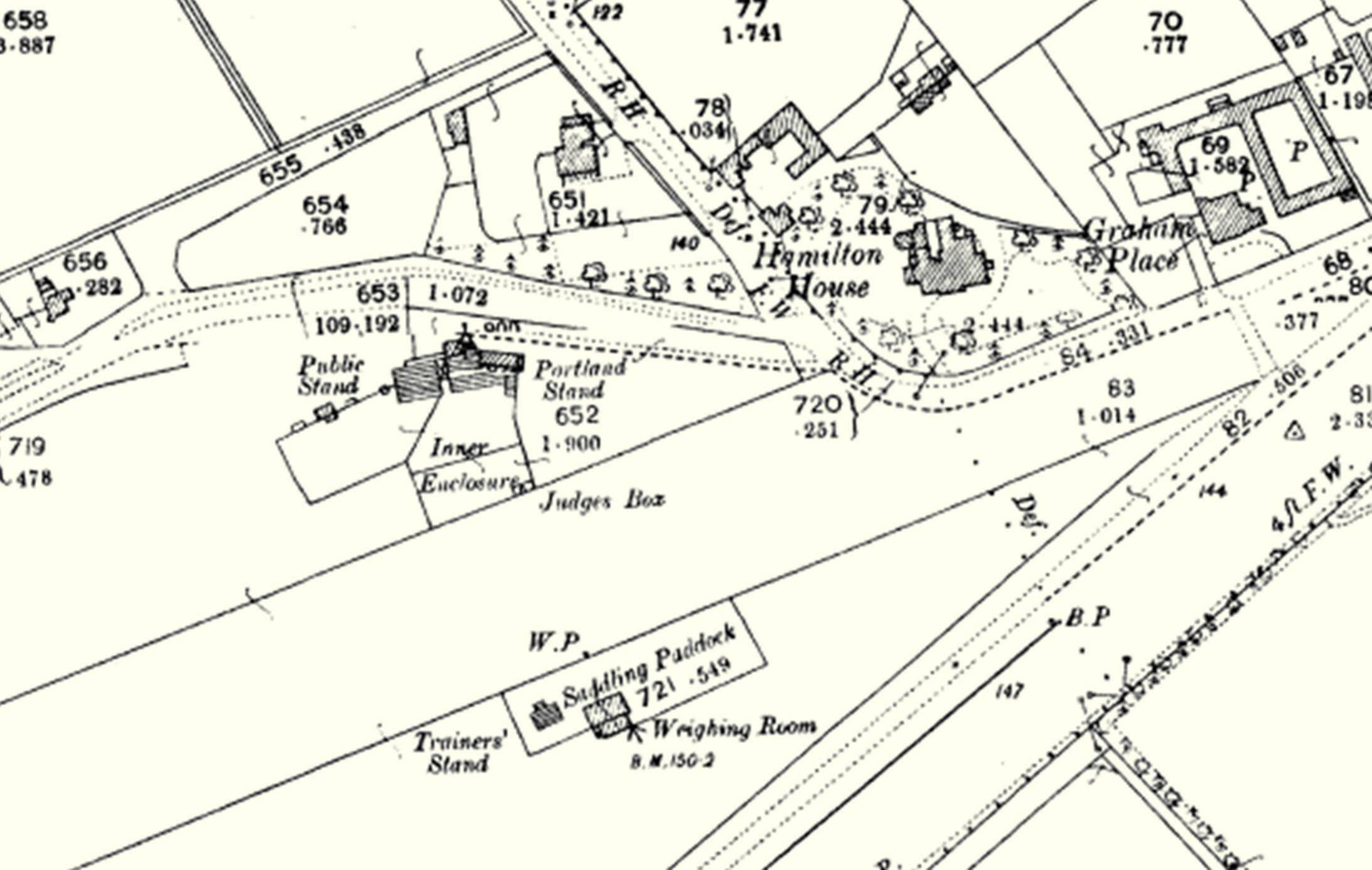 All of these stands were eventually replaced by later incarnations and the 1902 map below shows the much larger later version of the Portland Stand. Also by that time all the other old stands had gone, to be replaced by the Trainer's Stand and Saddling Paddock.