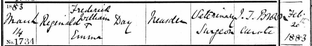 Frederick (Fred) William Day was the son of William Day and Mary Carloss Peart, he was born in Fiddington, Gloucestershire on 21st December 1854. He qualified as a veterinary surgeon in 1878 and in 1881 was living and working as such in Victoria Cottage, East Street, Tewkesbury, with his younger sister Rosa Mary Day.