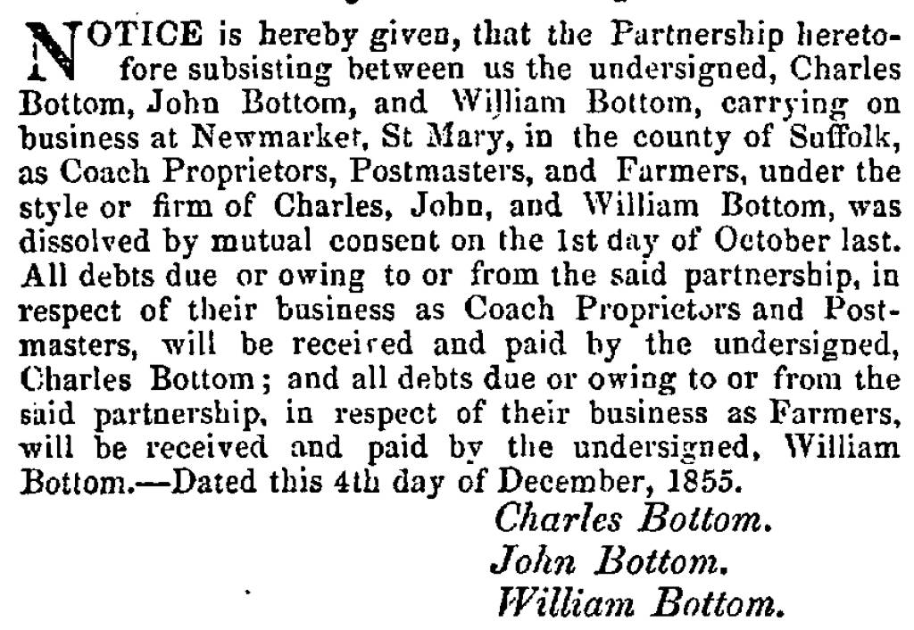 | 4th December 1855 | Dissolution of partnership between Charles Bottom, John Bottom and William Bottom |