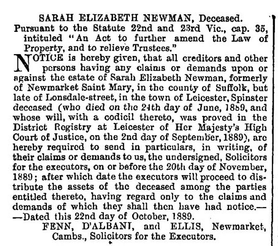 Other notable occupiers on this site were the Newman family. Starting with John Newman, who was born in Newmarket to parents John Newman and Elizabeth (née Lait) in 1786, and was a Baker. Also living with him here was his brother William Newman, born in 1795 who was a cabinet maker & upholsterer. Records seem to suggest that John died in 1842. William and his family stayed here for quite a while after that, and following his death his daughter Sarah Elizabeth Newman can be seen living here until at least 1881. Sarah's brother John Newman, another upholsterer, moved to live in Leicester and from the following article in the London Gazette it can be seen that Sarah had followed him there.