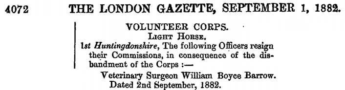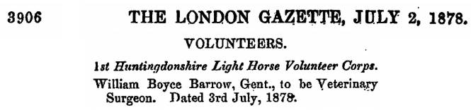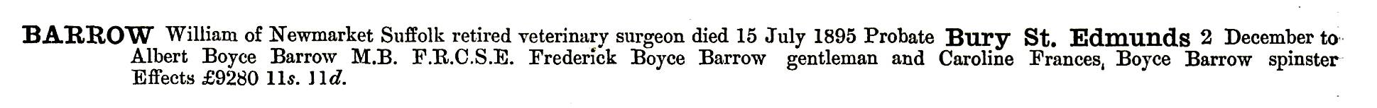 Bury and Norwich Post 12 May 1868 Mr. William Boyce Barrow, of Newmarket has been admitted a member of the Royal College of Veterinary Surgeons, and received his certificate to practice. |