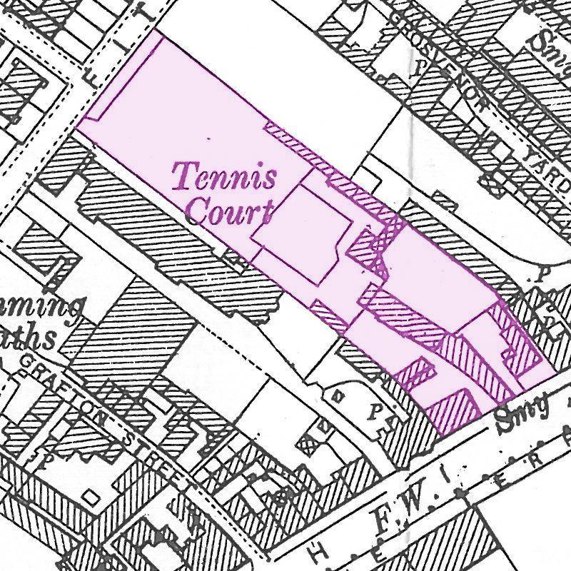 The picture above right is from a 1901 map of Newmarket and shows that the buildings that are present today on this plot of land had been built by that time. The unnamed building in the centre on the High Street is shown as a Smithy (Smy) - i.e. blacksmiths. The title Tennis Court refers to the Real Tennis court building in the adjacent plot of land that at one time was owned by Crisswell's Garage - No.170-176 High Street.