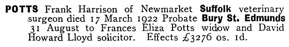 In the 1909-1912 Phone Books not only is he listed as a veterinary surgeon at No.2 Denson Terrace, but also at 'The Queensbury' [?]. He died in Newmarket on 17th March 1922 and is buried in Mill Road cemetery, Cambridge.