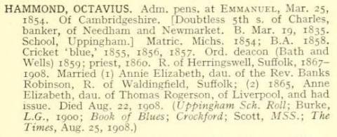 THE REV. OCTAVIUS HAMMOND, who died at Herringswell on August 22nd [1908], was born at Newmarket on March 19th, 1838, and educated at Uppingham, where he was in the Eleven from 1850 to 1852, being Captain in his last year. In 1855 and two following years he played for Cambridge against Oxford, but made only 23 runs in five completed innings. In Scores and Biographies (v.-30) he was described as A very fine, free hitter, and an admirable field at long-leg or cover-point. At Fenner's in 1857 he scored 52 not out for the University against the Cambridge Town Club, who had Buttress, Reynolds, and Arnold to bowl for them. Mr. Hammond had been Rector of Herringswell, Mildenhall, Suffolk, since 1867. |
