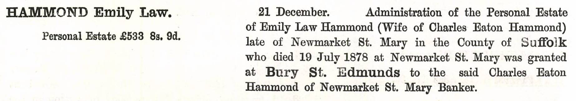 Emily Law Hammond sadly died young on 19th July 1878 and unusually