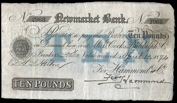 Newmarket Bank, Ten Pounds, 13 April 1874, no. 2968, for Hammond & Co, signed by Fred Hammond |