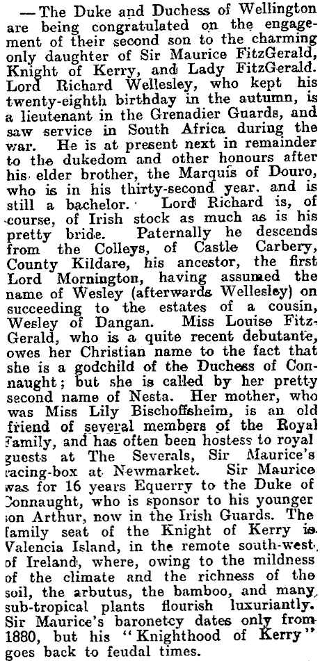 On 30th April 1908 Maurice & Amélie's daughter; Louise Nesta Pamela FitzGerald, married Captain Lord Richard Wellesley, the son of Colonel Arthur Charles Wellesley, the 4th Duke of Wellington. Richard served in the Boer War, and sadly was killed during the First Battle of Ypres, near the village of Gheluvelt in Flanders, on 29th October 1914.