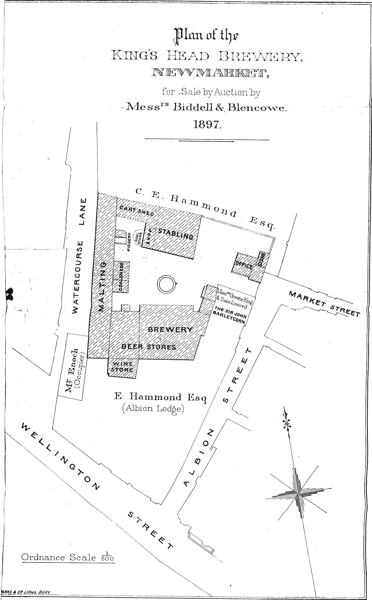 The estate was divided into 35 lots, the first of which was the brewery and requisites, which realized 1200l. ; the second, the residence attached, which made 1400l. ; the Barley Corn, Newmarket, made only 390l. , and the several other inns in the town and surrounding neighborhood sold as follows: - The White Lion, Newmarket, 820l., purchased by Mrs. Arber, the tenant; the Two Brewers, Albin-street, Newmarket, 430l. ; the Dolphin, Newmarket, 250l. ; the Wheatsheaf, Newmarket, 430l. ; the Horse and Groom, with dwelling and bake-house, Newmarket, 590l. ; the Griffin, Isleham, 700l. ; the White Horse, Exning, 720l. ; the Black Swan, Reach, 450l. ; the Bushel, Burwell, 200l. ; the Anchor, Burwell, 770l. ; the Rose, ditto, 410l. ; the Horn, Soham, 230l. ; the Plough, ditto with 3 acres of land, 320l. ; the Plough, with upwards of 3 acres of land, at Ashley, 780l. : the Cock, Kentford, 400l. ; the Bull, with land, Borough Green, 700l. ; the Waggon and Horses, Dullingham, 435l. ; the Prince Albert, with 2 acres of land, 100l. , which with other land and house property amounted to about 14,000l.