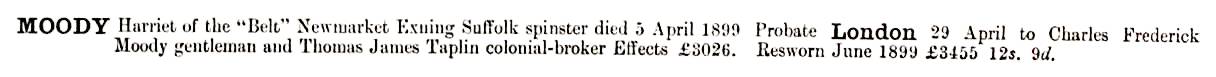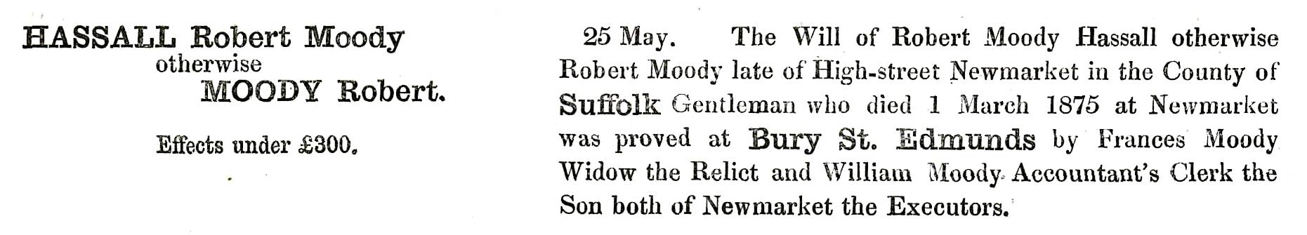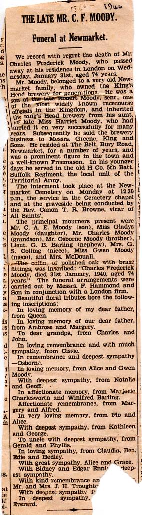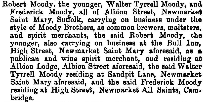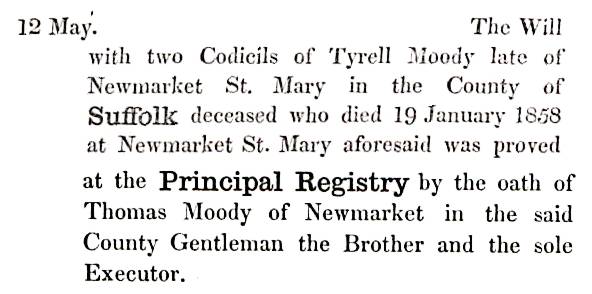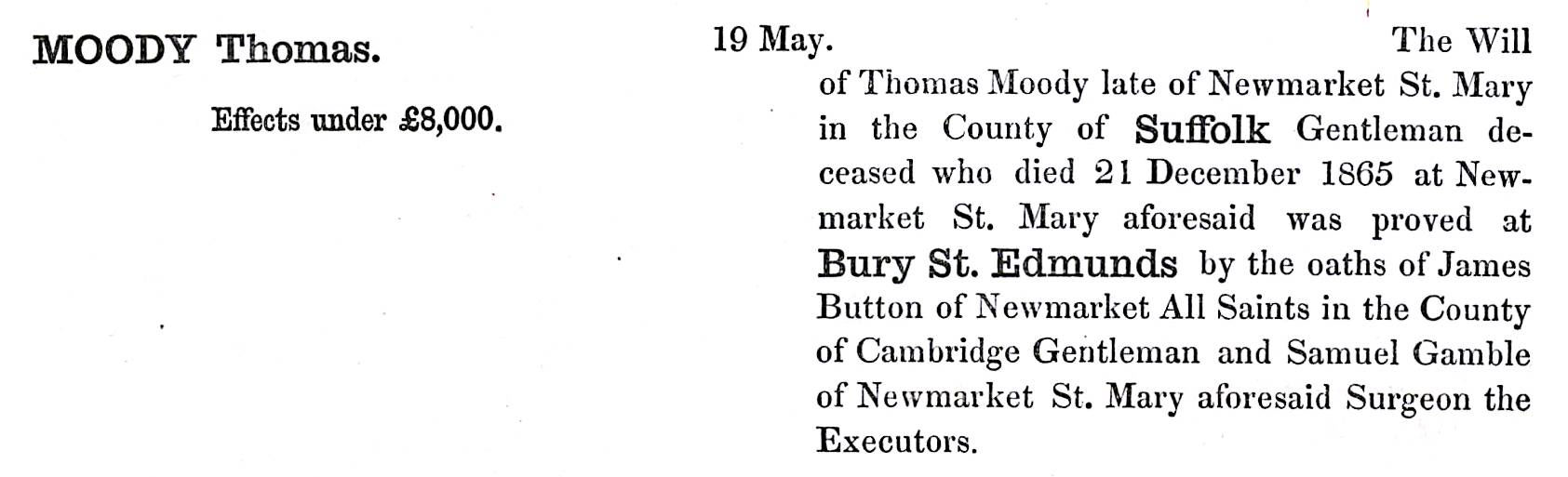 | Saturday 23 January 1858, Cambridge Independent Press Moody & Cole - At Newmarket, on the 19th instant, found dead in his bed, Tyrrell Moody, Esq., in the 79th year of his age; and on the same day, Mr. Thos. Cole, many years clerk to the above Tyrrell Moody, Esq., aged 51. Sudden Death.- On Tuesday morning, Mr. Tyrrel Moody, brewer of this town, was found dead in his bed. He went bed on Monday night in the same state of health and sprits. No inquest was required, the doctors could satisfactorily account for the cause of death, he having been very weak and infirm condition for time past. It is a very singular fact that his confidential clerk, Mr. Thos. Cole who had some time left the service of Mr. Moody in consequence ill health, died within an hour of his master. We understand that Mr. Moody had left Cole an annuity, the principal which will revert the Moodys’ estate. |