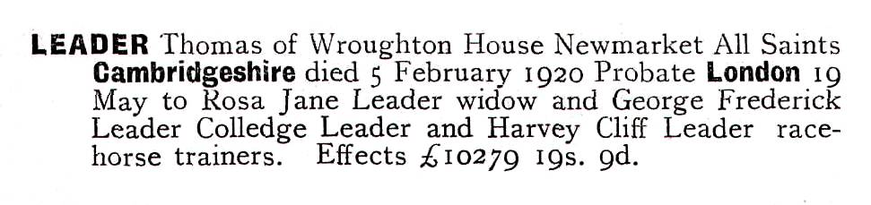 Thomas Richard Leader died in Newmarket on 24th June 1945.